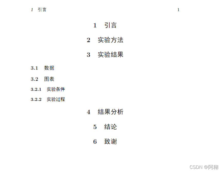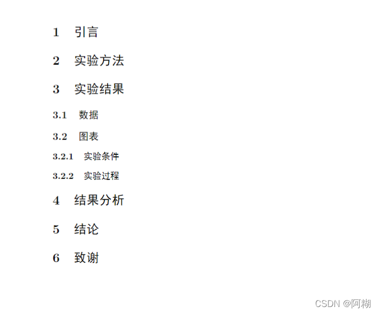 % 导言区 \documentclass{article} \usepackage{ctex} % 正文区 \begin{document} \section{引言} \section{实验方法} \section{实验结果} \subsection{数据} \subsection{图表} \subsubsection{实验条件} \subsubsection{实验过程} \section{结果分析} \section{结论} \section{致谢} \end{document}