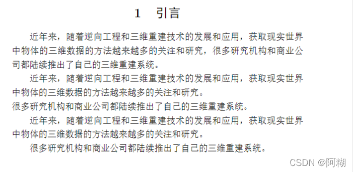 \section{引言} 近年来,随着逆向工程和三维重建技术的发展和应用,获取现实世界中物体的三维数据的方法越来越多的关注 和研究,很多研究机构和商业公司都陆续推出了自己的三维重建系统。 % 空行代表另起一段 % \\代表换行,但不会首行缩进 近年来,随着逆向工程和三维重建技术的发展和应用,获取现实世界中物体的三维数据的方法越来越多的关注 和研究。\\很多研究机构和商业公司都陆续推出了自己的三维重建系统。 % \par代表另起一段,含首行缩进,作用等同于空行 近年来,随着逆向工程和三维重建技术的发展和应用,获取现实世界中物体的三维数据的方法越来越多的关注 和研究。\par 很多研究机构和商业公司都陆续推出了自己的三维重建系统。