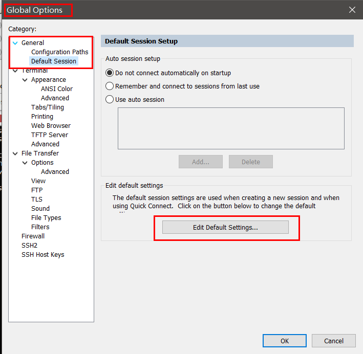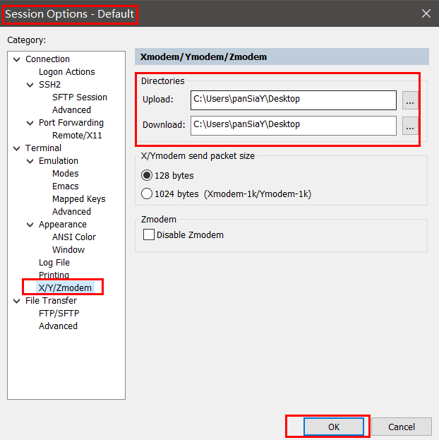 选项(option)->全局选项(global option)->General->Default Session->Edit Default Settings->X/Y/Zmodem