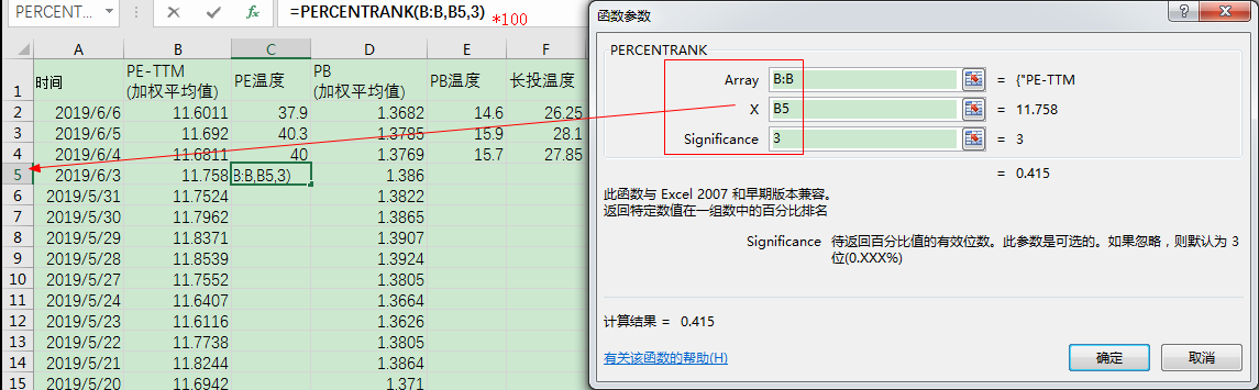 B:B数值xB5保留小数位数(Significance)3,注意在生成公式后加入*100即可计算出2019/6/3的PE温度 - 计算PB温度只需将上述所有B改成D即可