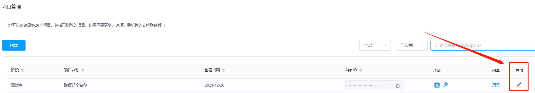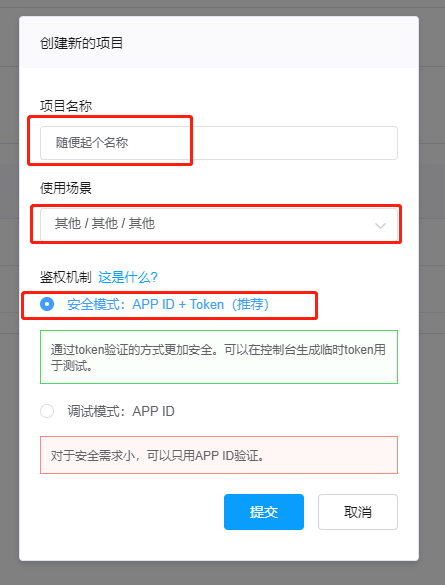 随便起个项目名称,随便选个使用场景,选择安全模式。保存提交