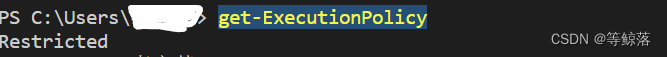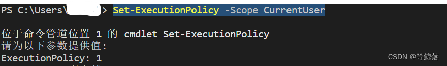 解决方案为:在终端执行Set-ExecutionPolicy -Scope CurrentUser命令,会返回一个参数让你填,填1即可,如下图: