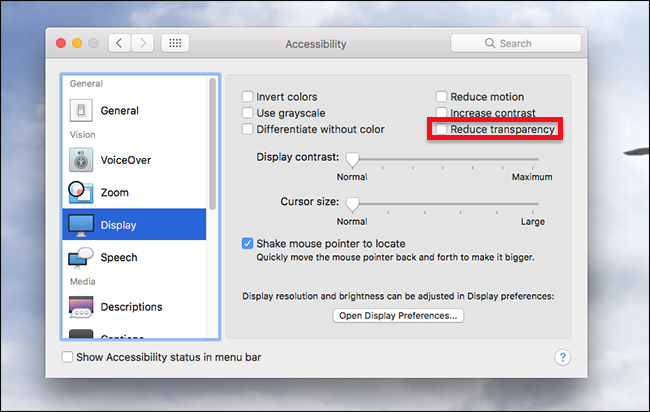 如果WindowServer即使在没有任何东西在运行的情况下仍然消耗大量电能,您仍然可以尝试一些方法。 首先,查看我们有关加快Mac速度的文章,特别是有关降低透明度的部分。 您可以在“系统偏好设置”>“辅助功能”>“显示”中找到此选项,众所周知,它可以减少WindowSever CPU的使用,尤其是在较旧的Mac上。