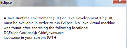6、双击eclipse.exe,打开运行一下,将会出现如下界面,这是因为我们还没有下载并安装JDK(即 Java的运行环境),参考JDK安装教程:https://www.jiagou1216.com/blog/devtools/344.html