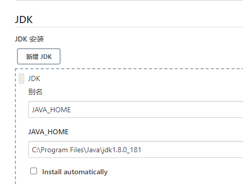 在Jenkins->Jenkins配置->全局工具配置中,新增JDK,选择你的JDK路径就可以了: