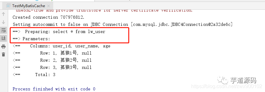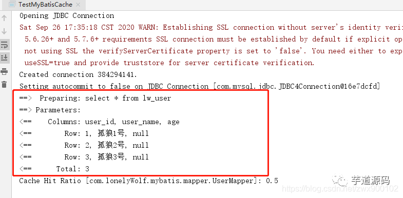 执行后,输出结果如下:我们可以看到,sql语句只打印了一次,这就说明第2次用到了缓存,这也足以证明一级缓存确实是存在的而且默认就是是开启的。