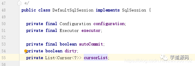 是的,自然是存储在SqlSession内是最合适的,那我们来看看SqlSession的唯一实现类DefaultSqlSession:DefaultSqlSession中只有5个成员属性,后面3个不用说,肯定不可能用来存储缓存,然后Configuration又是一个全局的配置文件,也不合适存储一级缓存,这么看来就只有Executor比较合适了,因为我们知道,SqlSession只提供对外接口,实际执行sql的就是Executor。