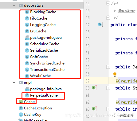 需要注意的是decorators包下面的所有类也实现了Cache接口,那么为什么我还是要说Cache只有一个实现类呢?其实看名字就知道了,这个包里面全部是装饰器,也就是说这其实是装饰器模式的一种实现。
