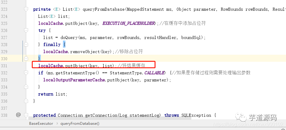 queryFromDatabase方法中会将查询得到的结果存储到localCache中