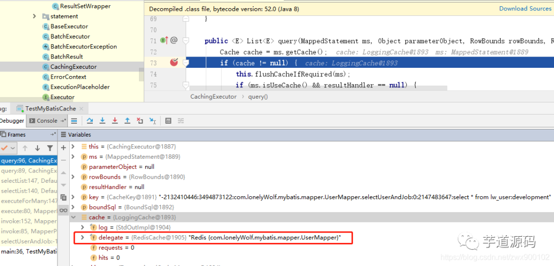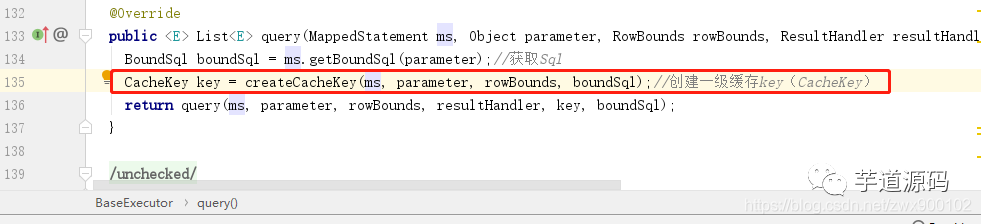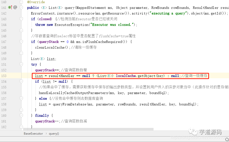 3、如果没有获取到二级缓存则执行被包装的Executor对象中的query方法,此时会走一级缓存中的流程。