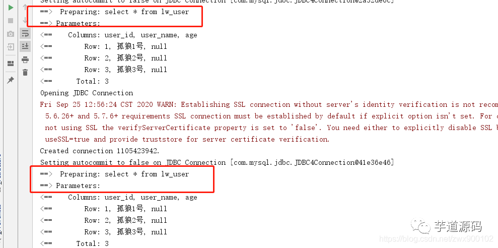 这时候再次运行,输出结果如下:可以看到,打印了2次,没有用到缓存,也就是不同SqlSession中不能共享一级缓存。