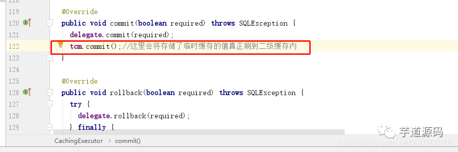 需要注意的是在事务提交之前,并不会真正存储到二级缓存,而是先存储到一个临时属性,等事务提交之后才会真正存储到二级缓存。这么做的目的就是防止脏读。因为假如你在一个事务中修改了数据,然后去查询,这时候直接缓存了,那么假如事务回滚了呢?所以这里会先临时存储一下。所以我们看一下commit方法: