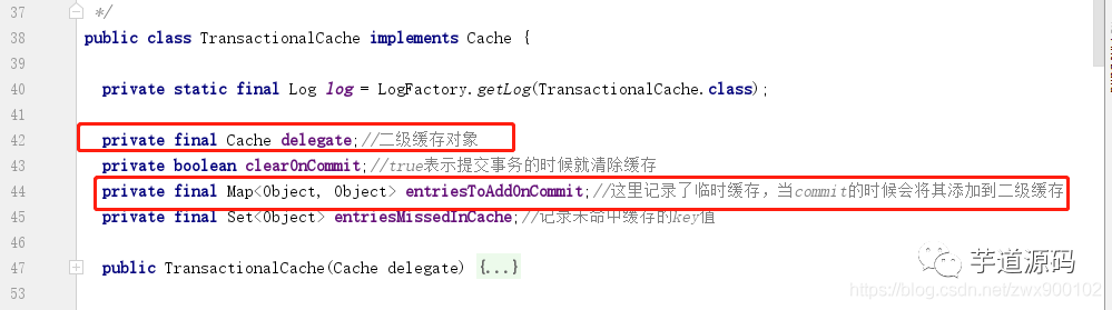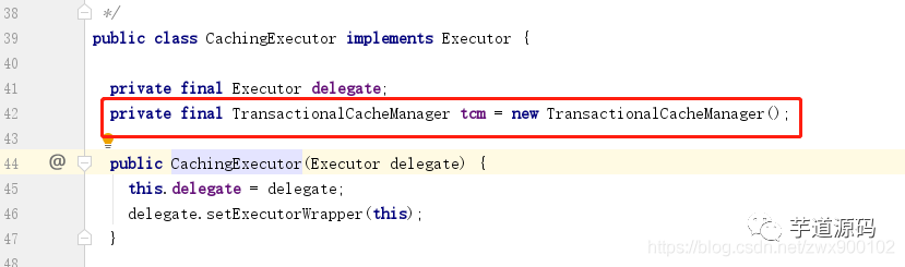 上面我们提到二级缓存是通过CachingExecutor对象来实现的,那么就让我们先来看看这个对象:我们看到CachingExecutor中只有2个属性,第1个属性不用说了,因为CachingExecutor本身就是Executor的包装器,所以属性TransactionalCacheManager肯定就是用来管理二级缓存的,我们再进去看看TransactionalCacheManager对象是如何管理缓存的: