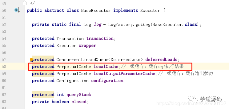 既然这样,那我们就进去看看Executor的实现类BaseExecutor:看到果然有一个localCache。而上面我们有提到PerpetualCache内缓存是用一个HashMap来存储缓存的,那么接下来大家肯定就有以下问题: