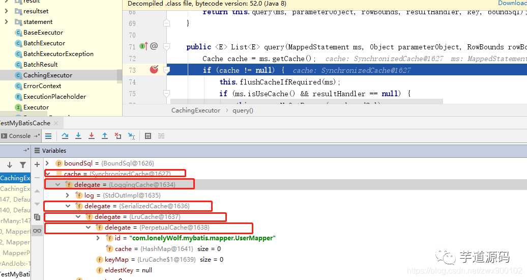 最开始我们提到了一些缓存的包装类,这些都到底有什么用呢?在回答这个问题之前,我们先断点一下看看获取到的二级缓存长啥样:从上面可以看到,经过了层层包装,从内到外一次经过如下包装: