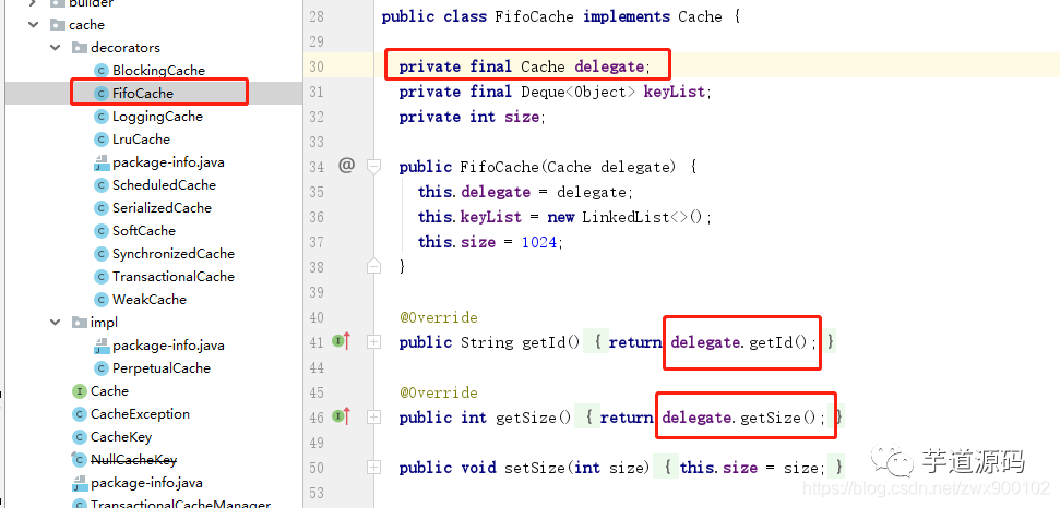 我们随意打开一个装饰器:可以看到,最终都是调用了delegate来实现,只是将部分功能做了增强,其本身都需要依赖Cache的唯一实现类PerpetualCache(因为装饰器内需要传入Cache对象,故而只能传入PerpetualCache对象,因为接口是无法直接new出来传进去的)。