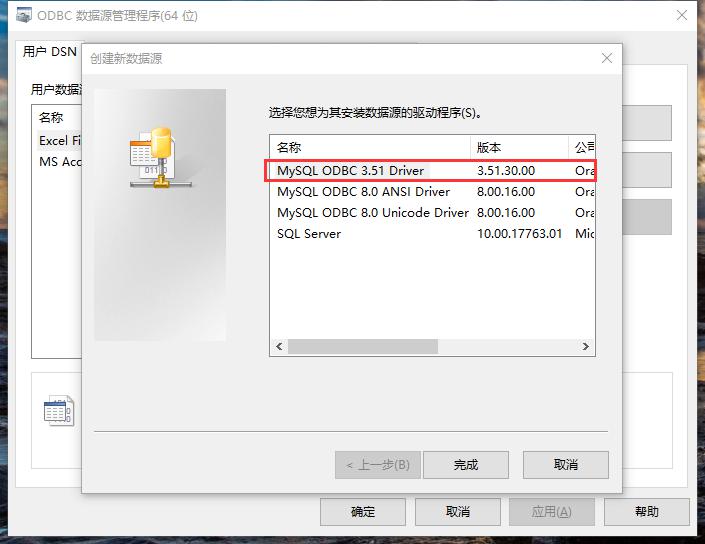 打开ODBC,在用户DSN下添加一个数据源,由于数据库的版本是比较旧的5.1.62,所以在选择ODBC驱动的时候选择了3.51的驱动(驱动程序在压缩包里提供了)。