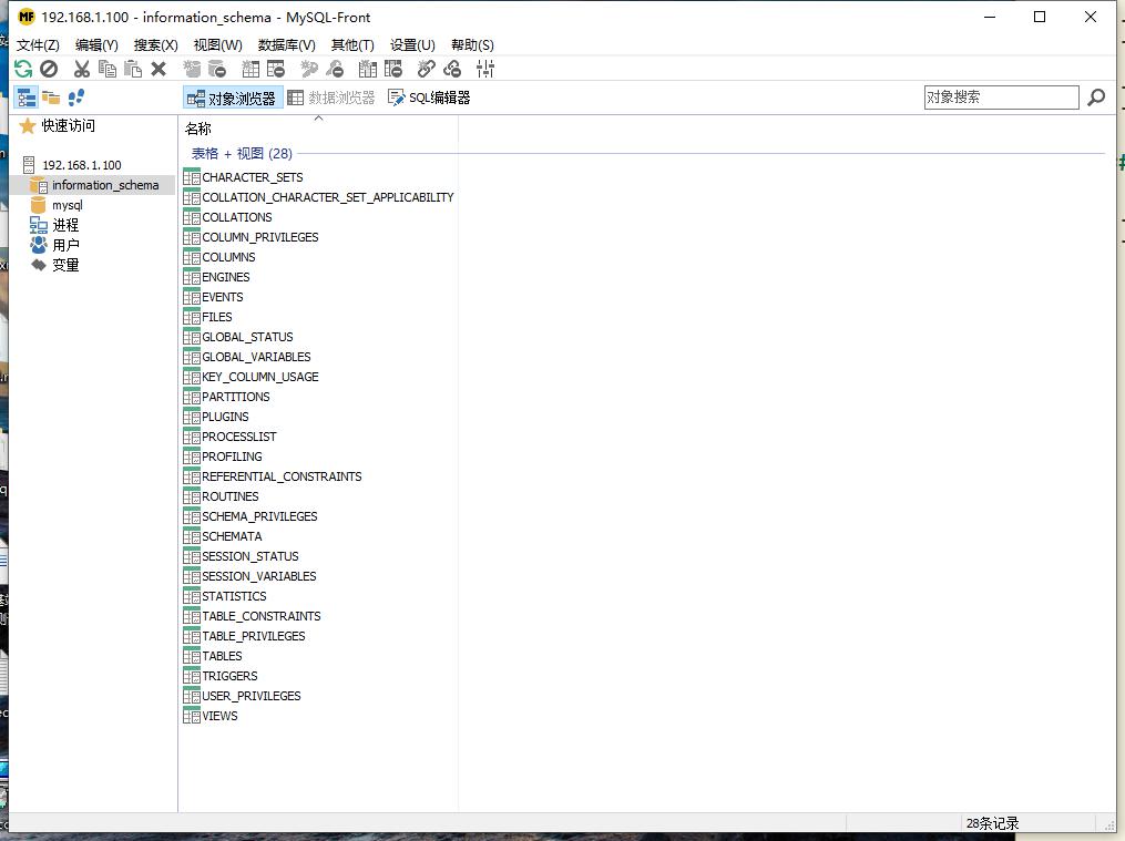 连接成功后可以看到默认的两个数据库information_schema和mysql