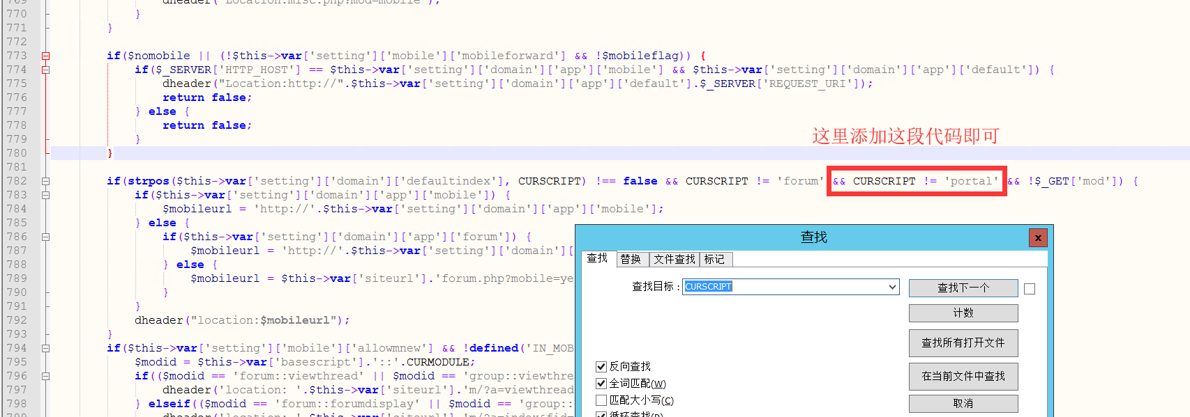 注意:访问手机端发现进入门户页(portal.php)后自动跳转至论坛(forum.php)时,请打开 source/class/discuz/discuz_application.php 文件,在792行添加如下代码 "&&CURSCRIPT != 'portal' "即可