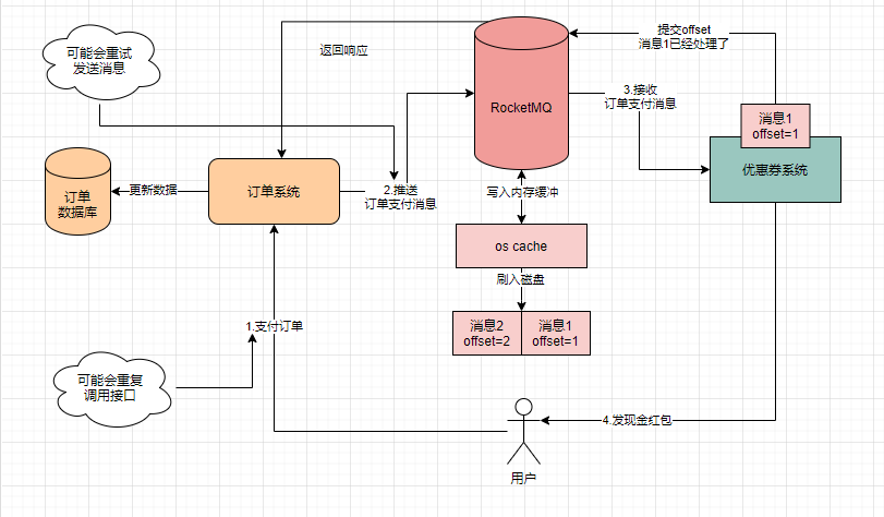 在前面的场景中,订单系统的接口可能会被重复调用导致发送重复的消息到MQ去,也可能自己有重试机制导致发送重复的消息到MQ。