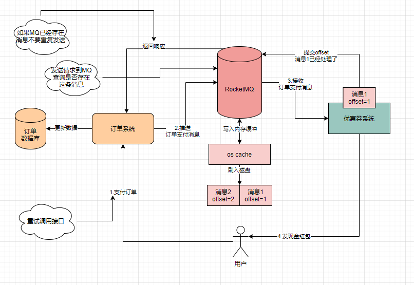 所以当你的订单系统的接口被重试调用的时候,在接口上发送请求到MQ去查询 id=1100 这个订单的支付成功消息,就能确定是否已经发送过该消息到MQ了,如果有,就不要在重复发消息了。