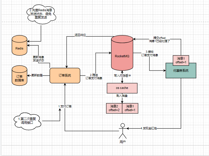 这就存在一种情况,此时生产者将消息成功写入MQ,在收到commit状态时,正好要将订单id写入Redis的时候,生产者突然宕机了,那么就没能写入Redis中。在订单系统重启后,订单接口被重调,向Redis中是查询不到已经发送过当前订单消息的标识数据的,就会再次发送消息,从而导致重复发送消息。