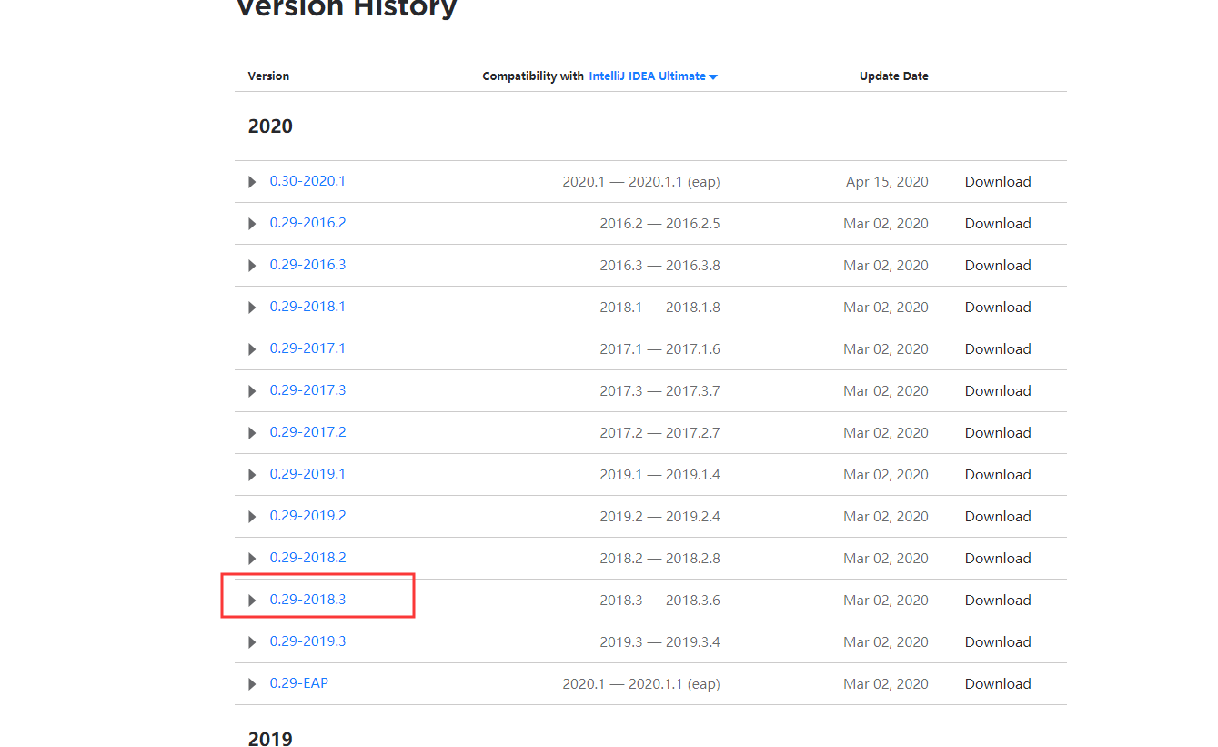 比如我的idea版本是2018.03版本,所以我在网站中下载2018.03版本,因为我试过前后版本,本地导入是都报错