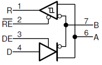 RS-485和RS-232单端传输不一样,是差分传输,使用一对双绞线,其中一根线定义为A,另一个定义为B,一般收发器内部是一个发送器加一个收发器组成。对于使能信号,字母上面加一横的为低电平有效,不加的为高电平有效。逻辑“1”以两线间的电压差为+(2 ~ 6)V表示;逻辑“0”以两线间的电压差为-(2 ~ 6)V表示,使能端起作用和其他状态时为高阻态。