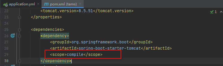找到pom.xml文件里的容器依赖,如下图如果没有<scope>标签,或者标签是这样的<scope>provided</scope>,需要修改为<scope>compile</scope>