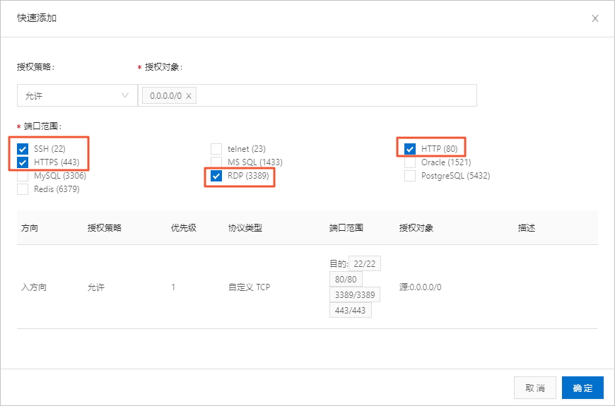 - 单击快速添加,按以下设置添加安全组规则,未提及的配置保持页面默认选项。