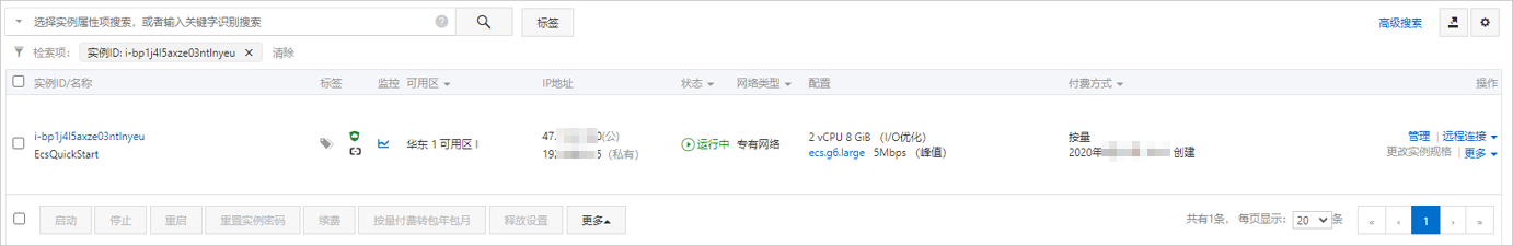 - 返回实例列表页面,找到本文的示例实例EcsQuickStart。