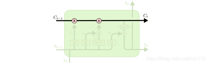 LSTM的关键在于细胞的状态整个(绿色的图表示的是一个cell),和穿过细胞的那条水平线。