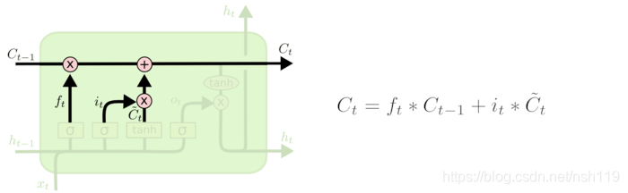 现在是更新旧细胞状态的时间了,我们把旧状态与相乘,丢弃掉我们确定需要丢弃的信息。接着加上