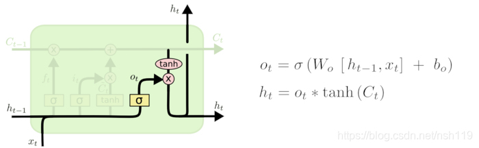 最终,我们需要确定输出什么值。这个输出将会基于我们的细胞状态,但是也是一个过滤后的版本。首先,我们运行一个 sigmoid 层来确定细胞状态的哪个部分将输出出去。接着,我们把细胞状态通过 tanh 进行处理(得到一个在 -1 到 1 之间的值)并将它和 sigmoid 门的输出相乘,最终我们仅仅会输出我们确定输出的那部分。