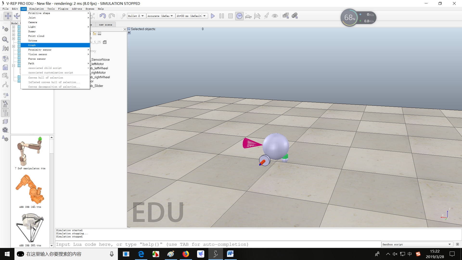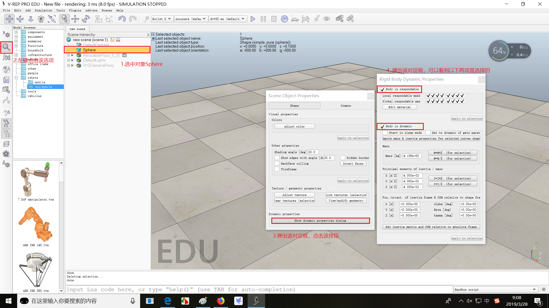 另外这个添加的球体Sphere是dynamic和respondable的,这意味着Sphere具有运动学属性并且可以和其他物体发生相互作用,这种属性在object properties里面也可以看到