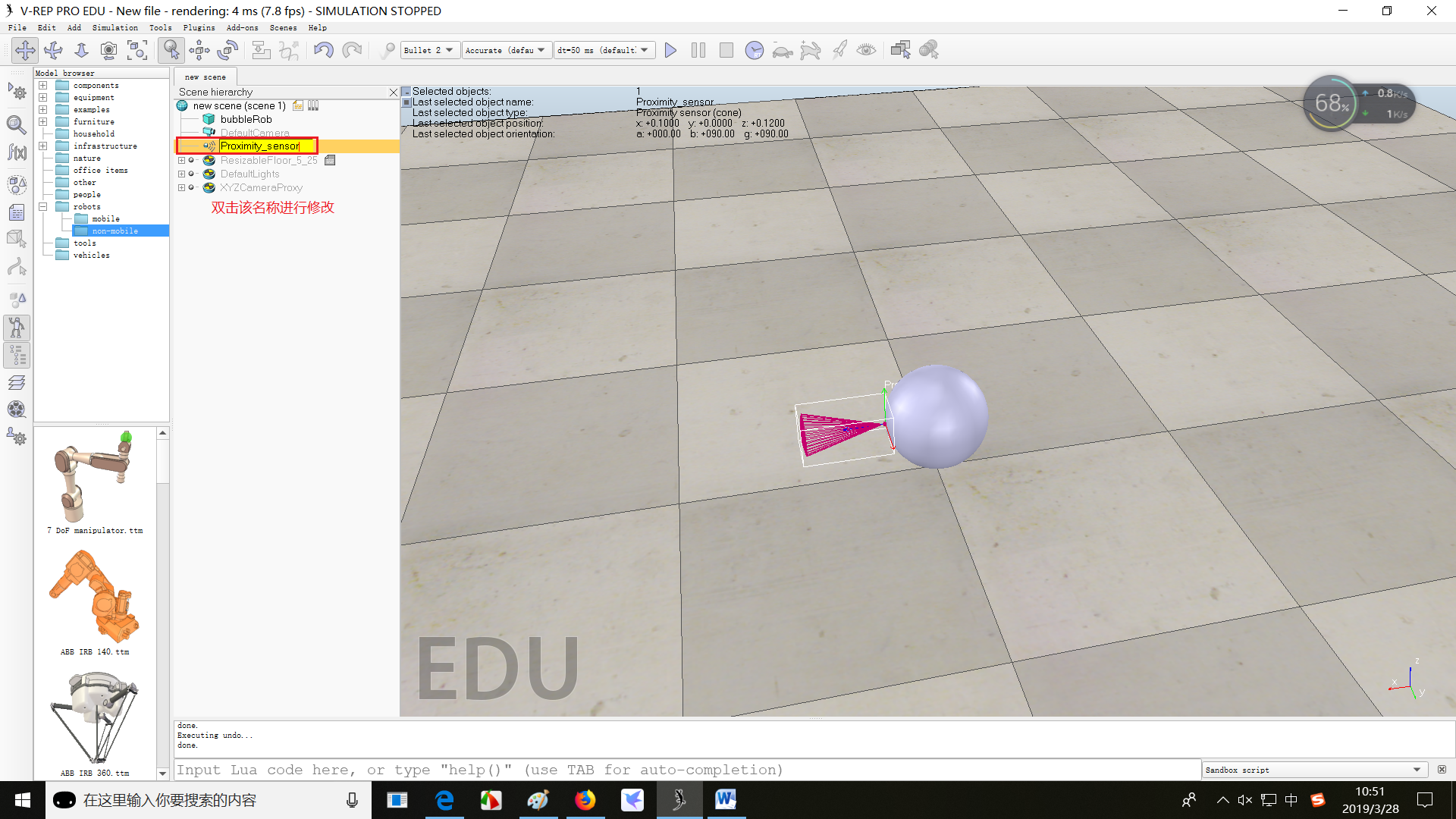 (4)修改proximity sensor(接近传感器)的名称为【bubbleRob_sensingNose】(图中名称有错误)