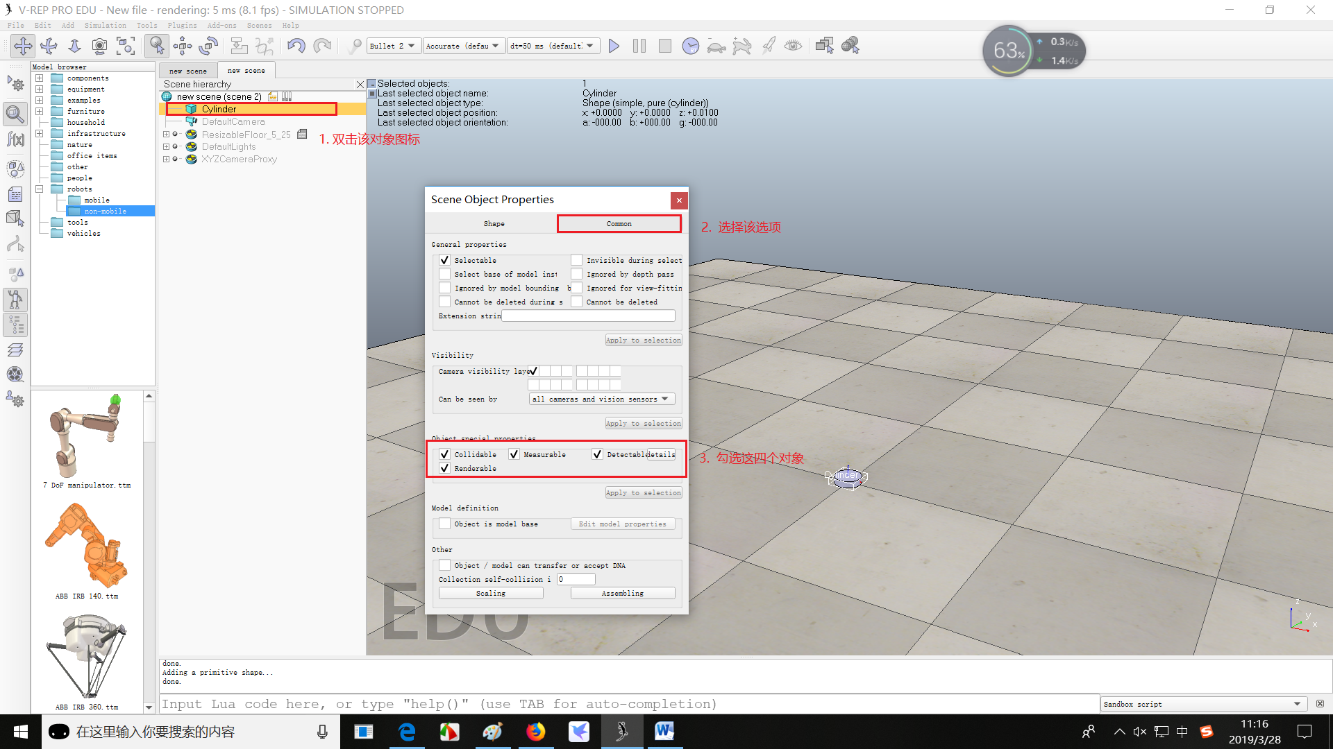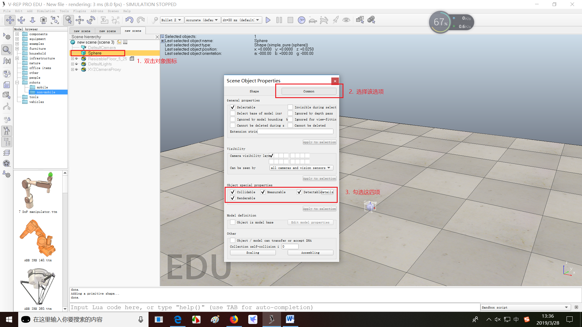 (3)为了让Sphere能够为calculation modules(这个在后面传感器计算物体之间的距离会用到)所用,需要使能Sphere的Collidable、Measurable、Renderable和Detectable属性,这个在object properties里面设置。除此之外,可以在Shape里面设置Sphere的外观属性比如颜色。