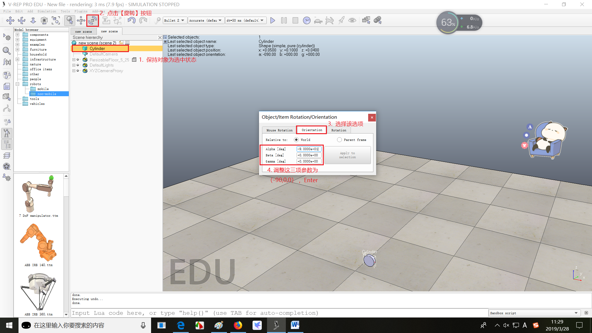 - 修改轮子的位置和方向,设置Cylinder的绝对位置(Position)为(0.05,0.1,0.04),绝对欧拉角(Orientation)(-90,0,0)