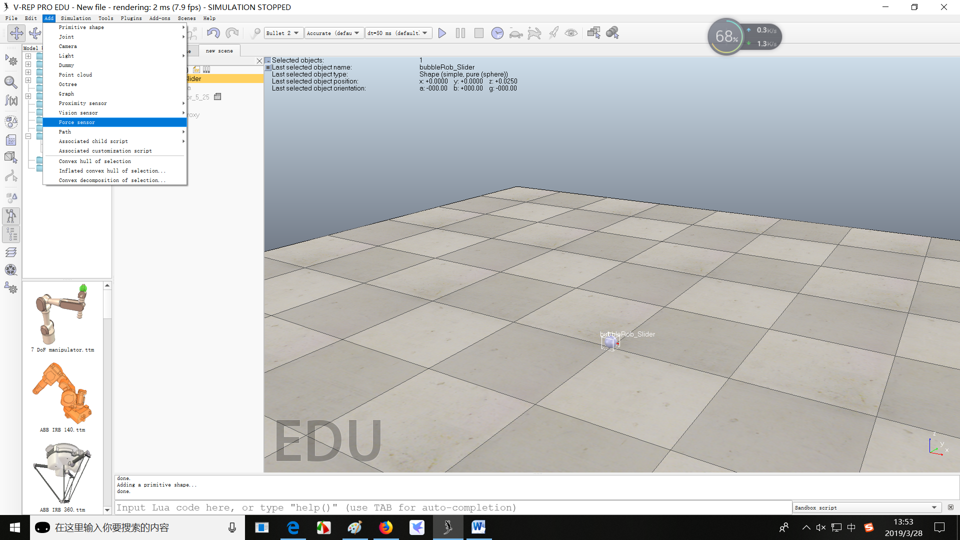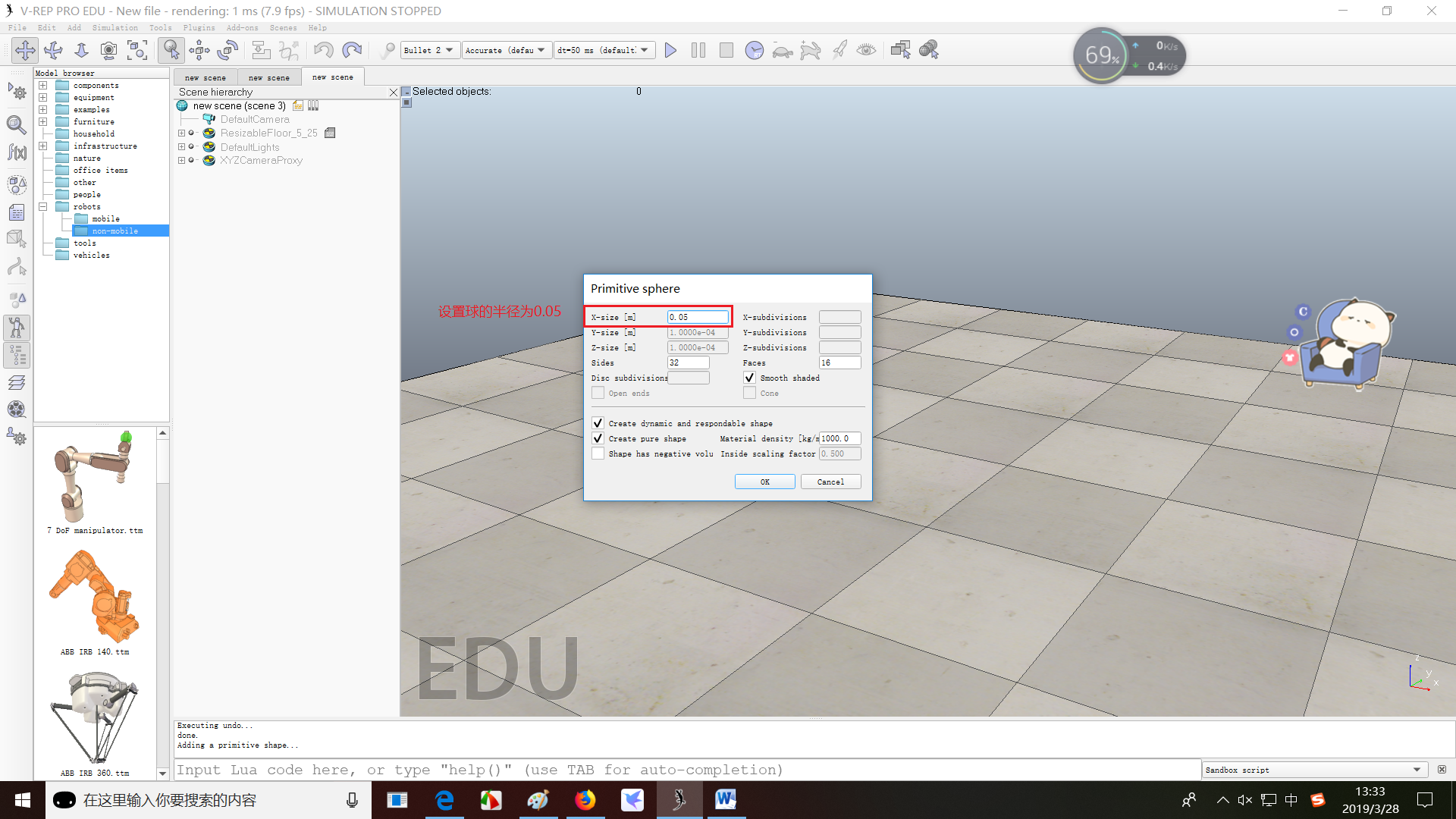 (1)在场景中添加一个直径为0.2的球。【Menu bar --> Add --> Primitive shape --> Sphere】