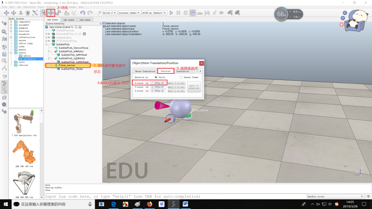 - 重命名force_sensor为bubbleRob_connection并把【力传感器】抬高0.05(下图有错误,应该是选择Translation中的Along-Z设置为0.05。如果用下图方式设置的话,应该在第4步修改Z-coord的值时,不应该直接改为0.05,而是在原来值的基础上加上0.05。因为Position是坐标的绝对坐标,Translation是相对坐标即移动了多少)