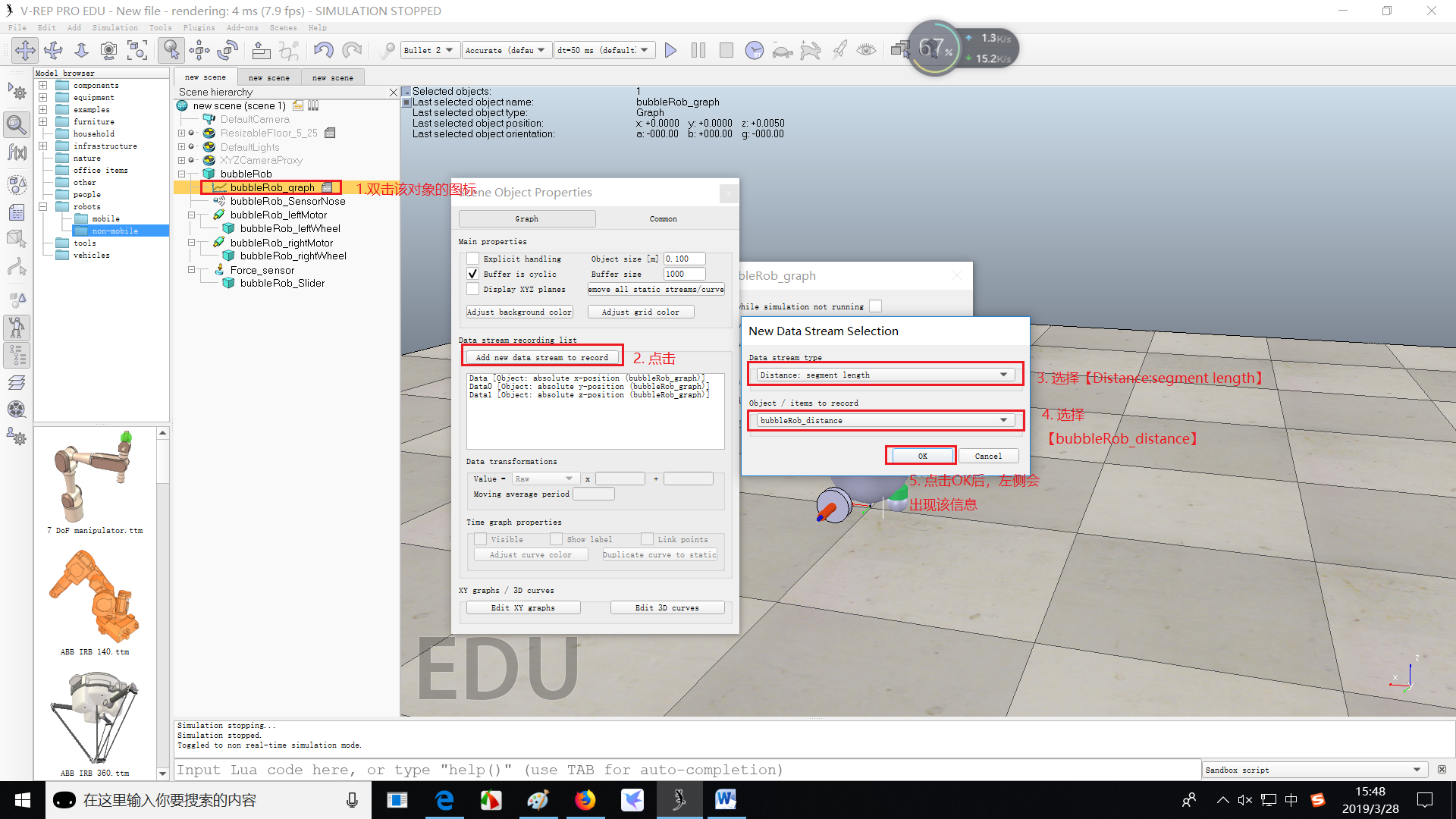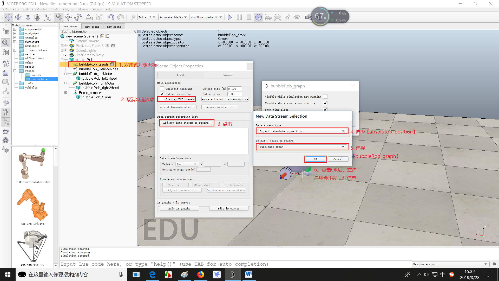 (4)现在我们有3个数据流表示BubbleRob的x-、y-和z-轨迹。我们将再添加一个数据流,这样我们就能够跟踪机器人与其环境之间的最小距离