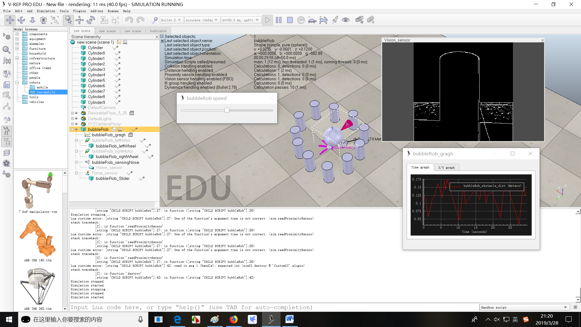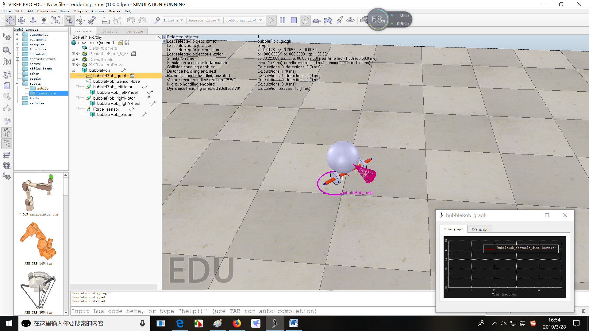 (4)设置一个电机的速度为50,开始仿真,可以在图中看到最近的距离