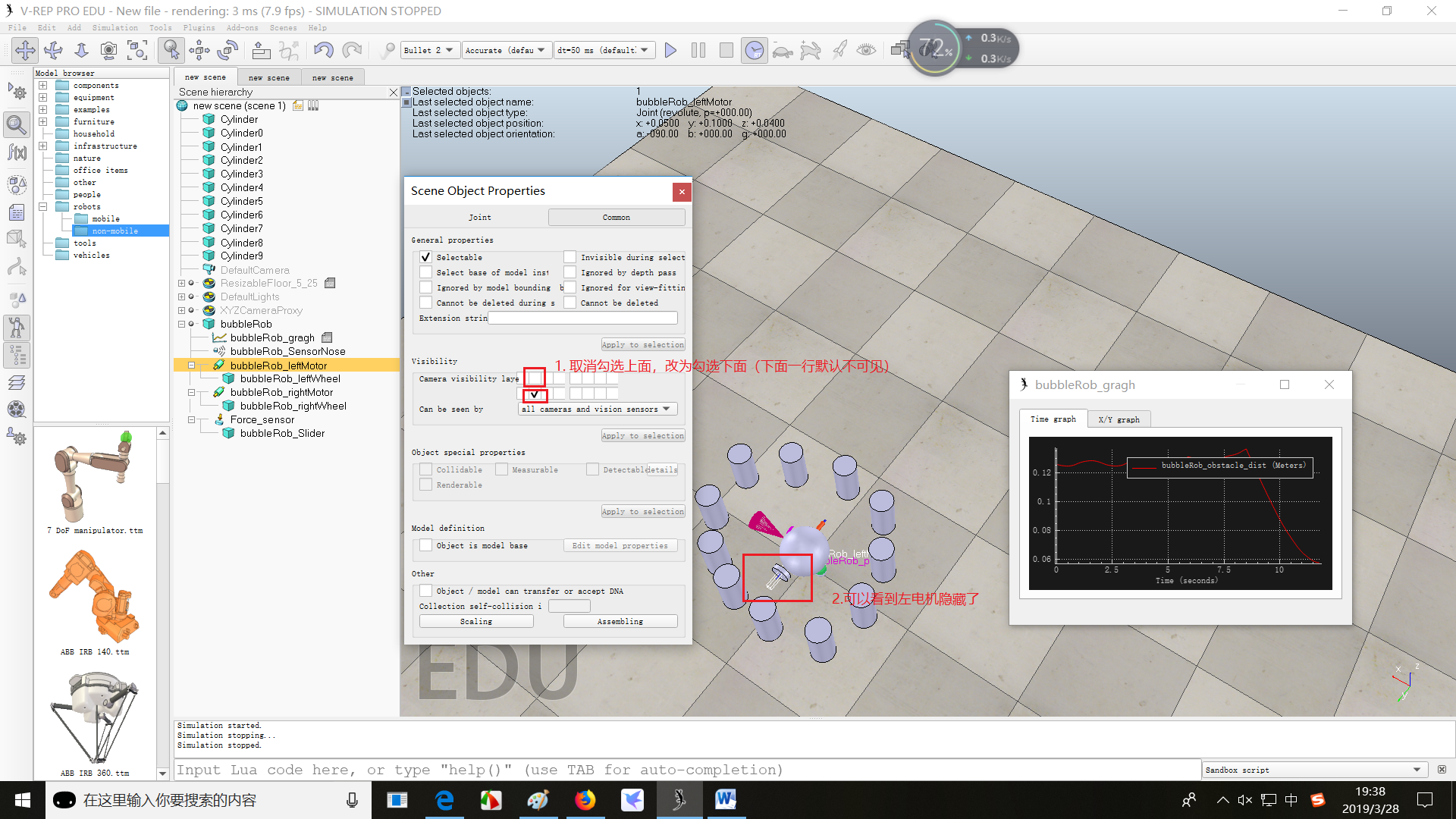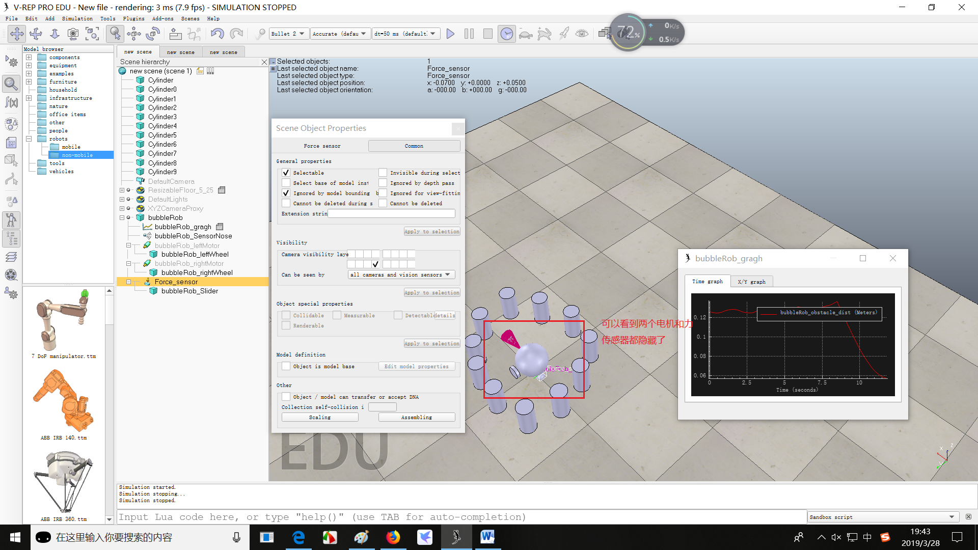 - 作为bubbleRob身体的一部分,对其进行属性调整,如同bubbleRob一样使能Cylinder的Collidable、Measurable、Renderable和Detectable属性