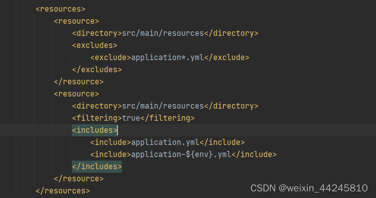 两个resource,第一个是排除对应的文件,第二个为动态加载,例如id为test,则花括号中的值就是test,而maven在build时也会排除掉其余环境配置文件!