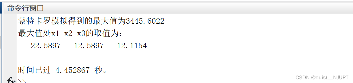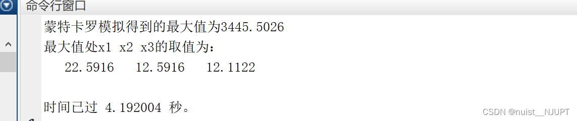 使用蒙特卡洛进行模拟的matlab代码如下,当然,可以 根据模拟的结果,对决策变量的范围进行缩小,然后再次模拟,会得到更加精确的值。