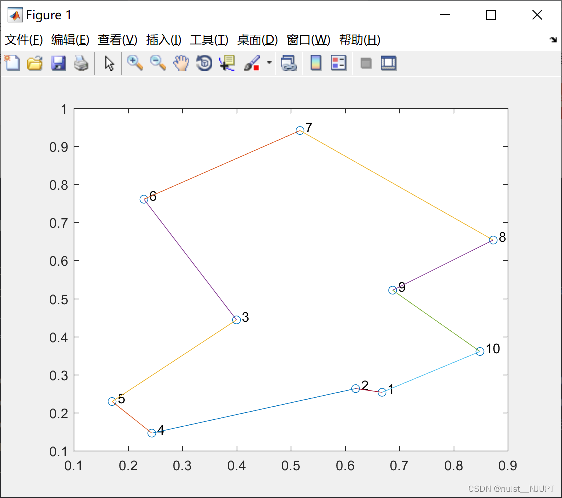 text(coord(i,1)+0.01,coord(i,2)+0.01,num2str(i)) % 在图上标上城市的编号(加上0.01表示把文字的标记往右上方偏移一点)