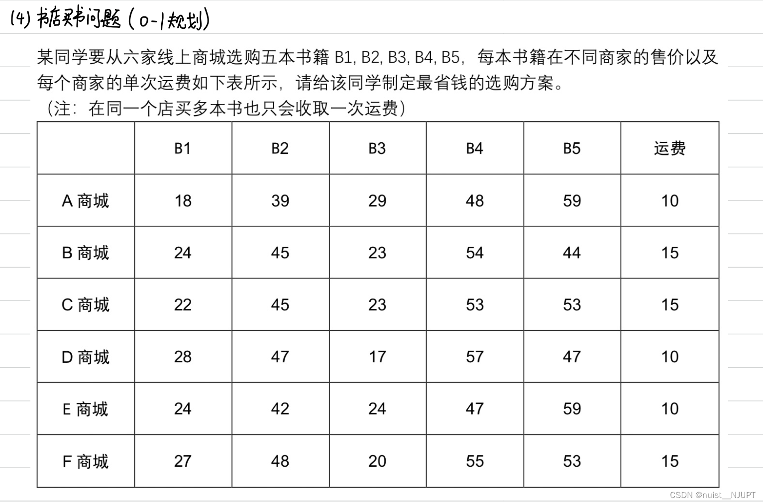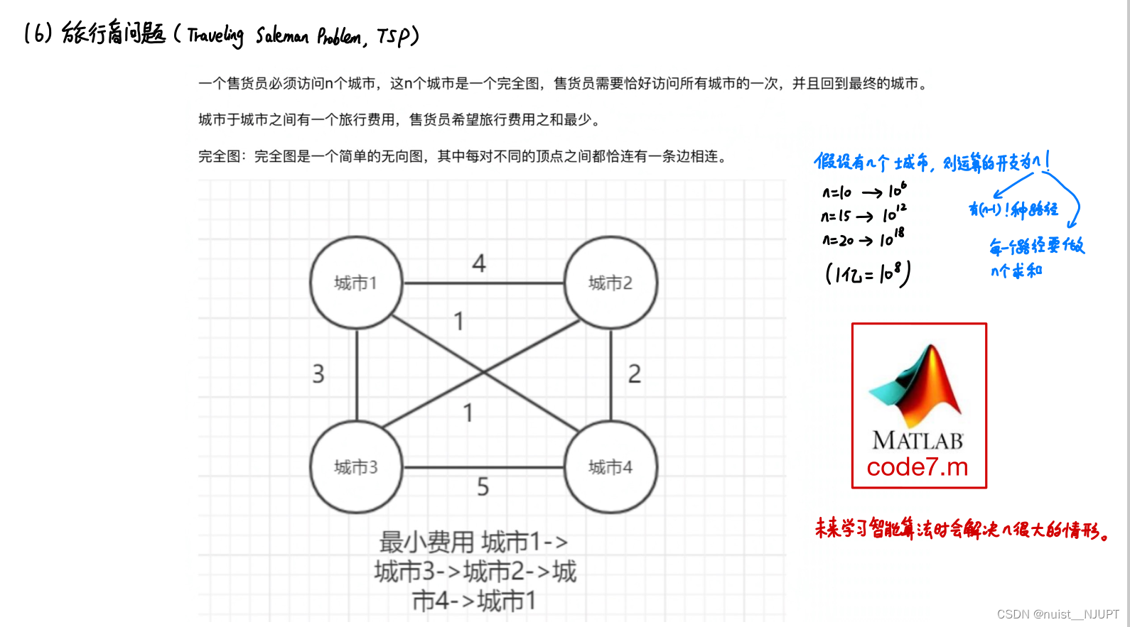 旅行商问题也是一个比较热门的问题,就是从一个城市开始走,访问所有城市,所有城市有且只走一次,最后回到原点,找出一种走法,使得费用最低,即边的总权重最小。