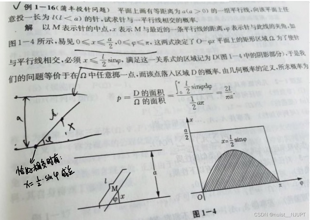 我们看一下布丰投针实验,就是画间距为a得平行线,在上面投针,针得长度为l,最后计算针与平行线相交的概率,这个概率除了和间距a以及针长l有关外,还和圆周率Π有关。