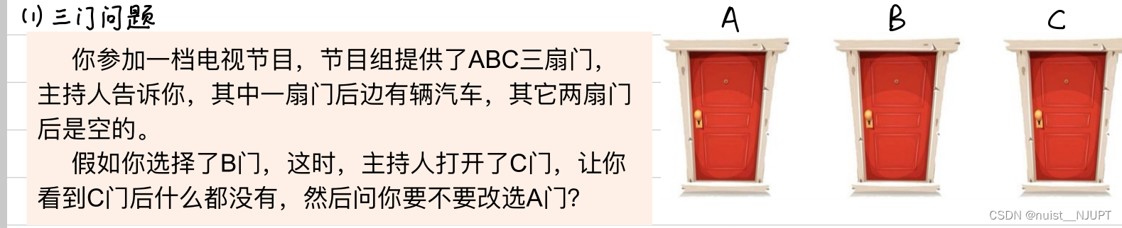 我们可以看一下三门问题,就是三个门,你选择其中一扇门,主持人给你打开了一个空门,问你要不要改选其它门,这个问题是个概率问题,我们可以通过蒙特卡洛方法进行模拟,然后观察是改选获奖的概率大,还是不改选获奖的概率大。