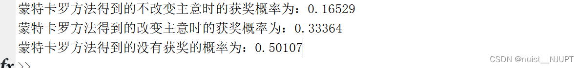disp(['蒙特卡罗方法得到的没有获奖的概率为:', num2str(c/n)]);通过运行结果我们可以发现,获奖和不获奖各占50%,但是改变主意的获奖率仍然是不改变主意获奖的概率的2倍。